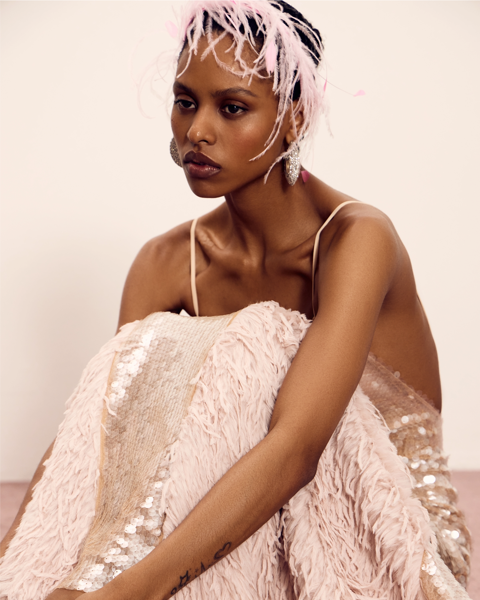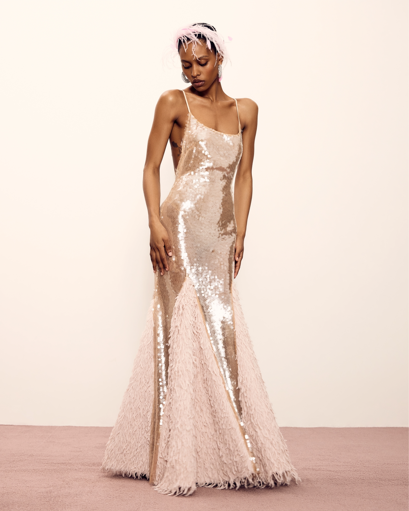 Боди-платье из эластичной сетки с паетками, открытая спина, лямки с регуляторами. Длина Макси, вставки из искусственного меха и перьев, основа издеоия-боди из сетки. Просим обратить внимание, что изделие изготавливается индивидуально под клиента.