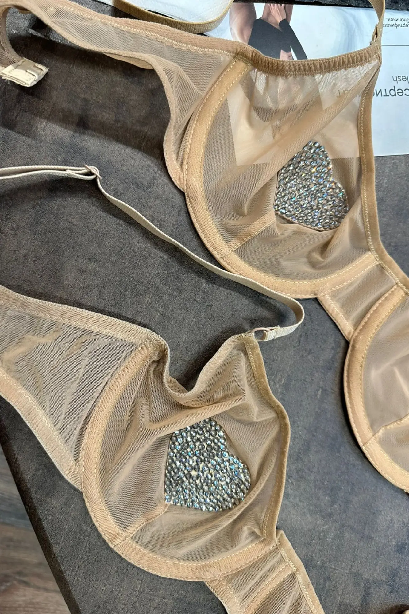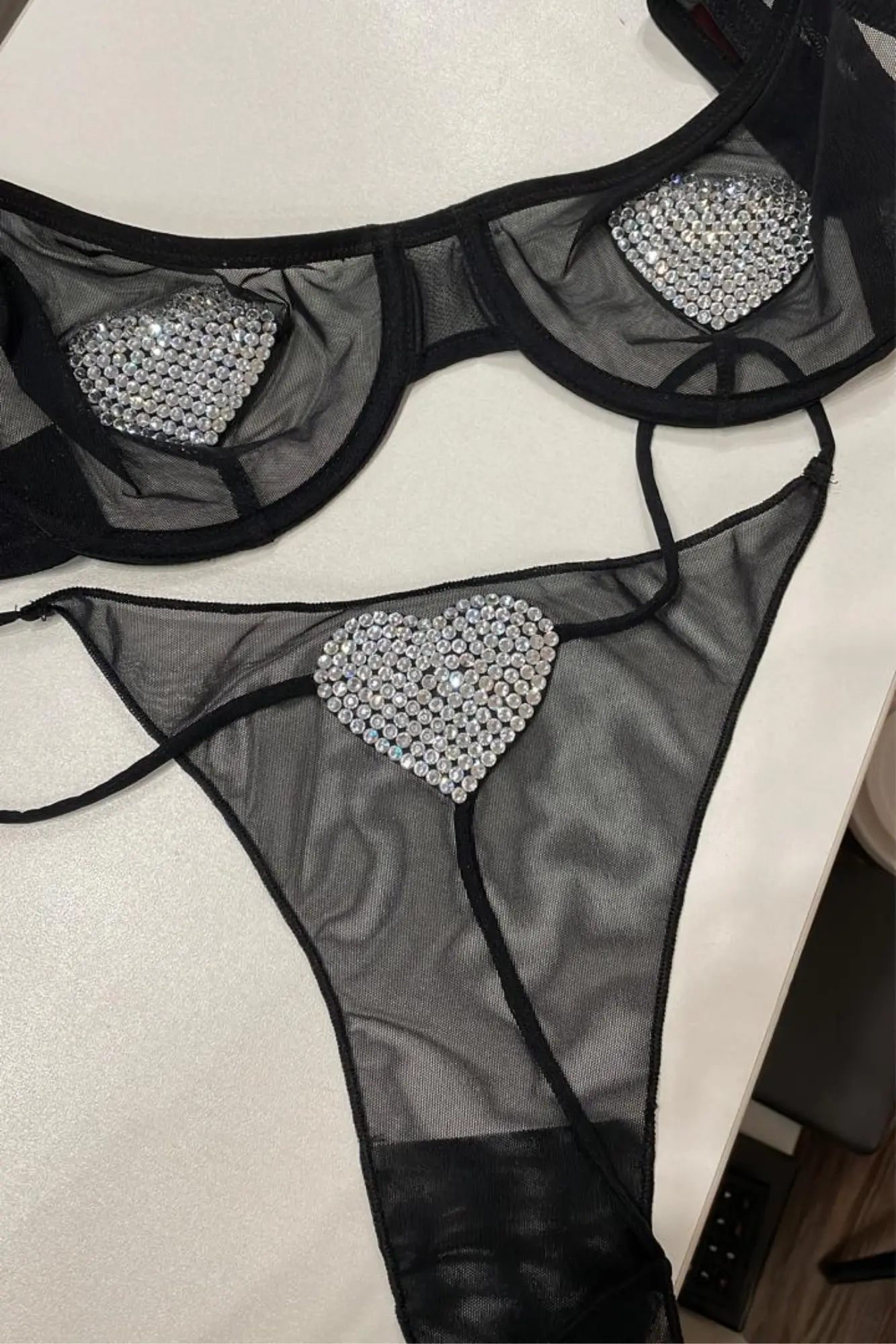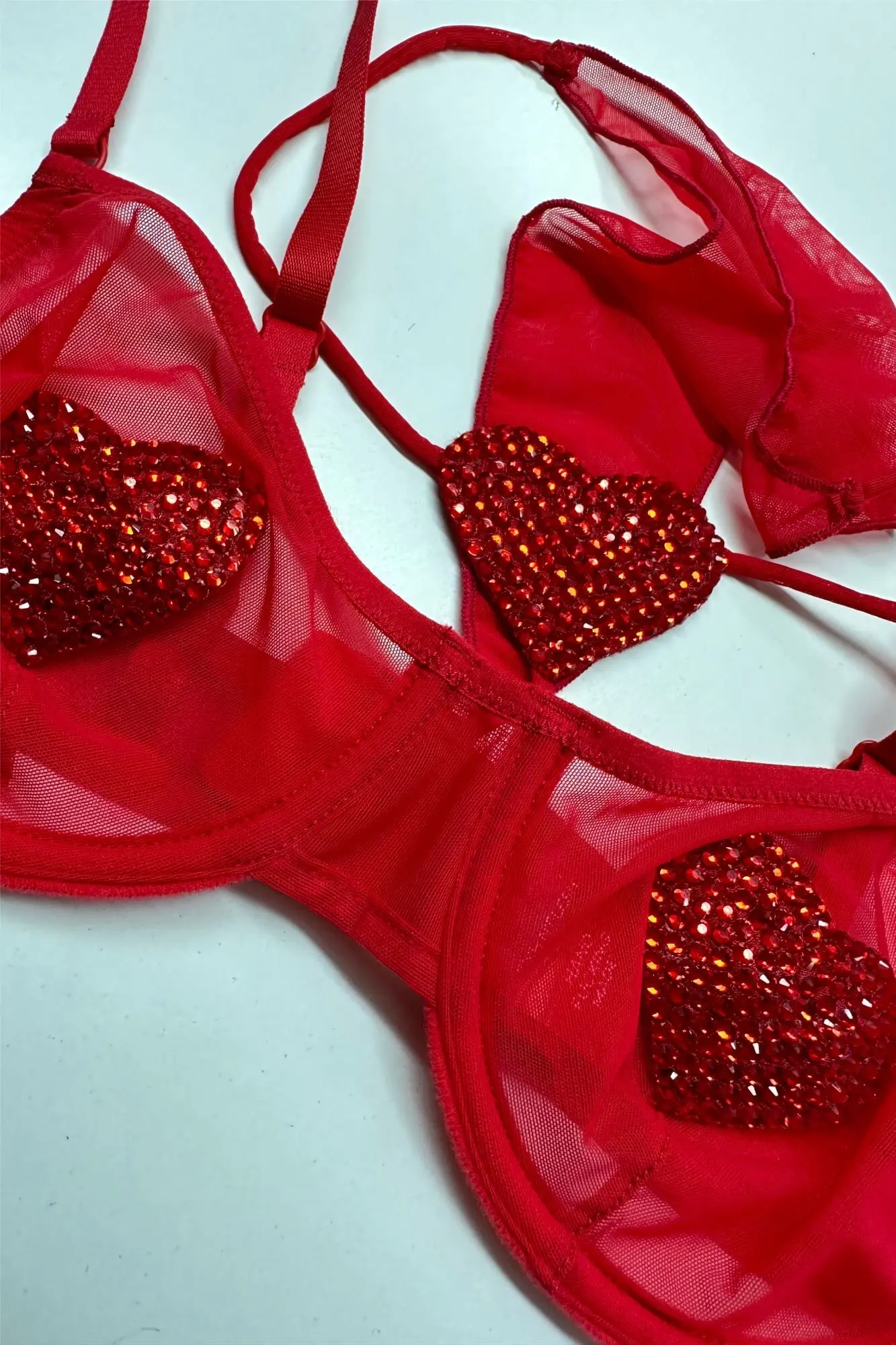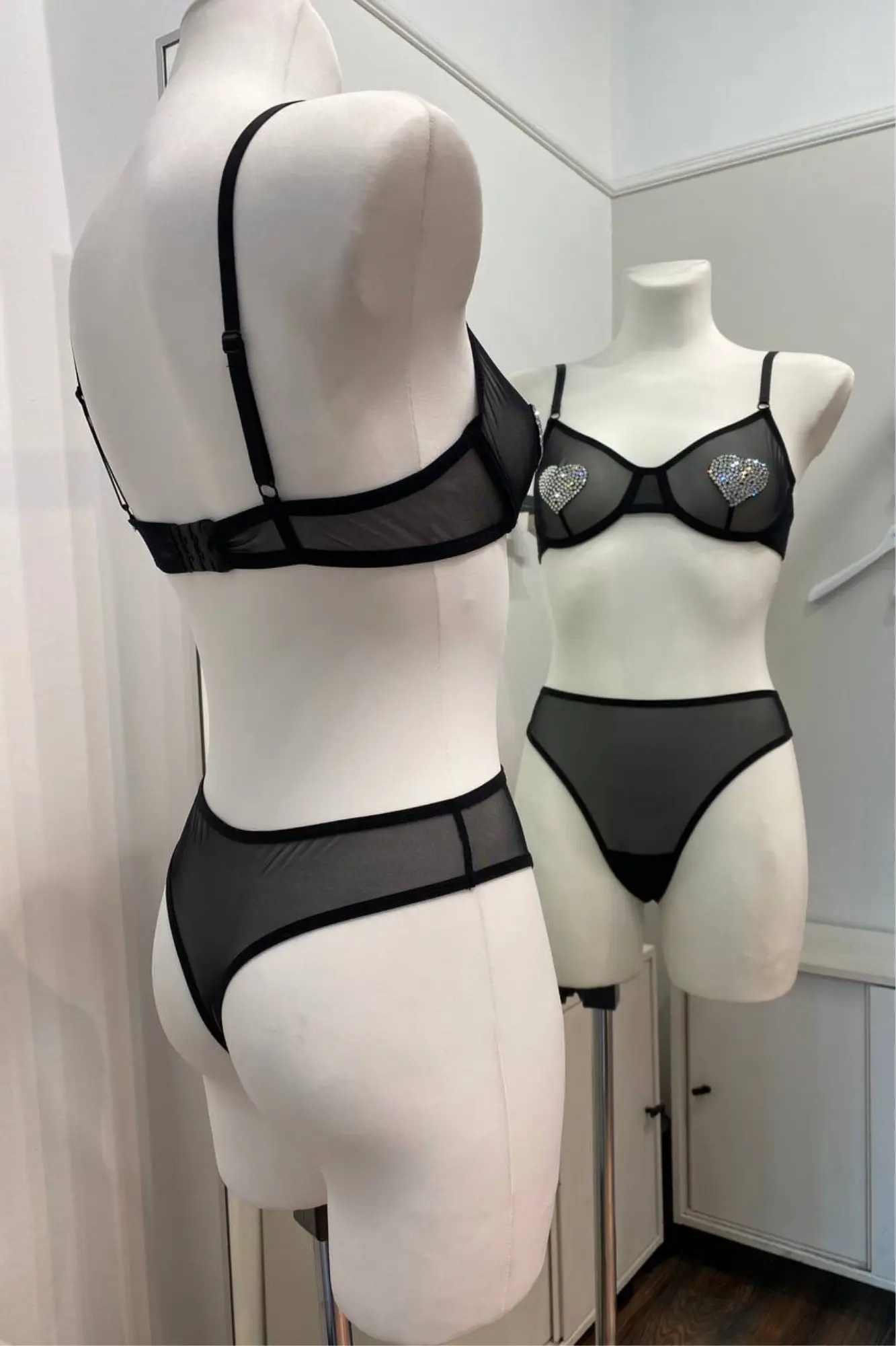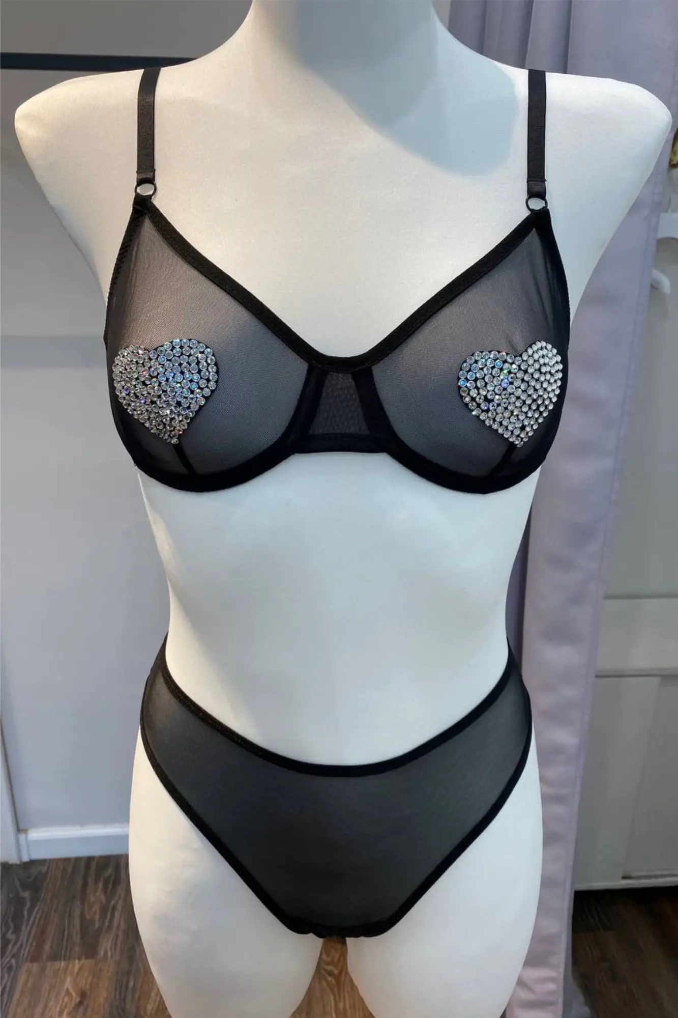 Лимитированный выпуск. Бюстгальтер из эластичной сетки на косточках, бретели с регуляторами, застёжка с крючками-регуляторами полноты объёма. Трусики-стринг с тонкими лямками.  На чашках и стрингах выполнена аппликация стразами Swarovski в виде сердец.
