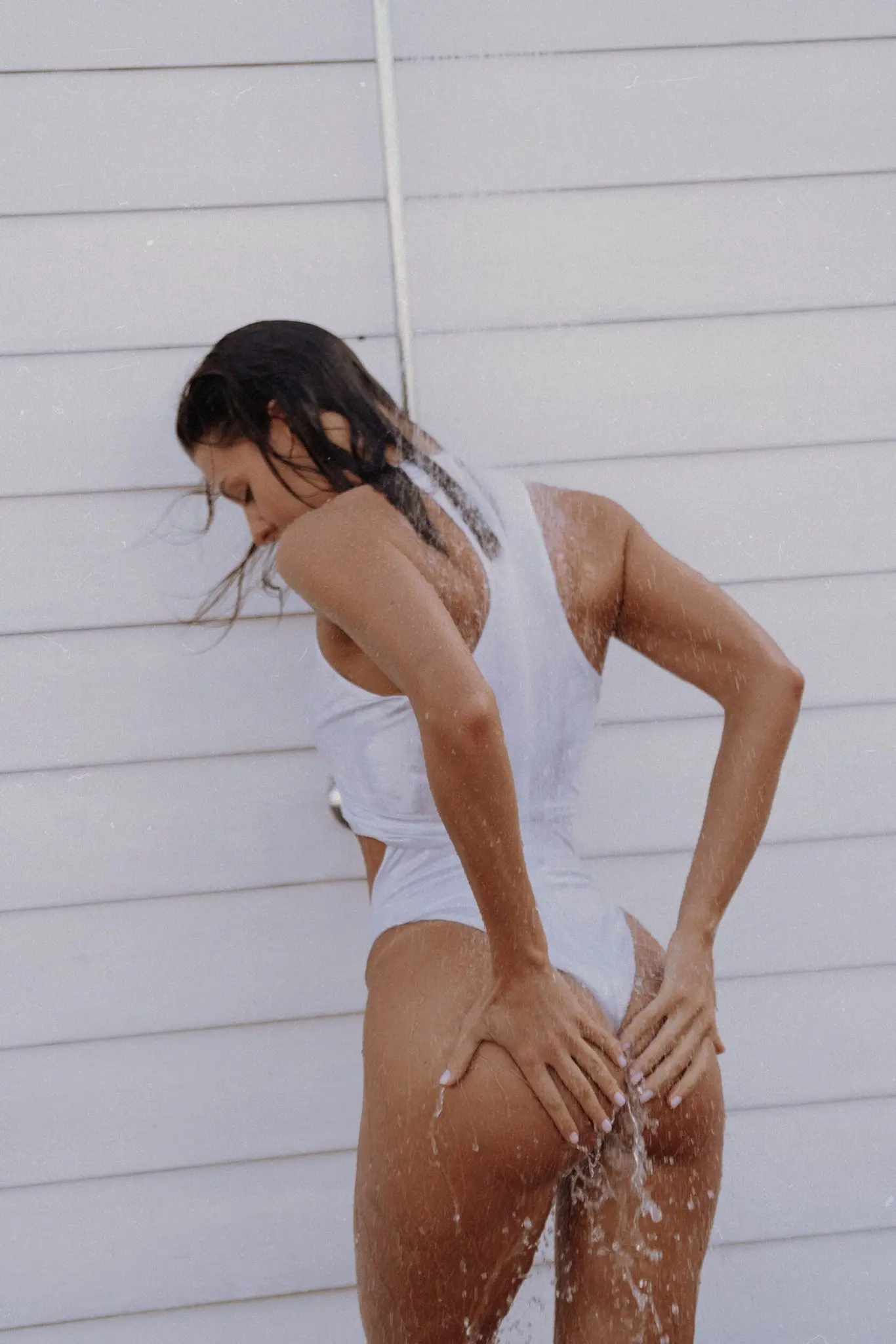 Купальник слитный из эластичного трикотажа, серебреный оттенок с металлическим напылением. Фигурный вырез на животе, трусики формы стринг.