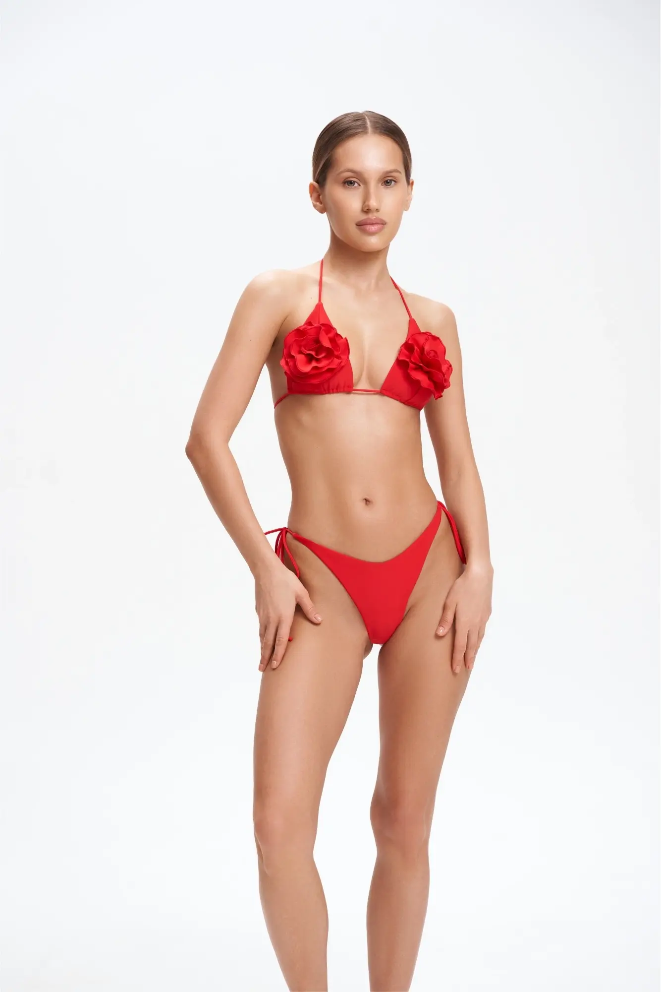 Топ-бикини, на завязках, аппликация в виде розы на чашках. Мягкая чашка, без вкладышей, продублирована сеткой.