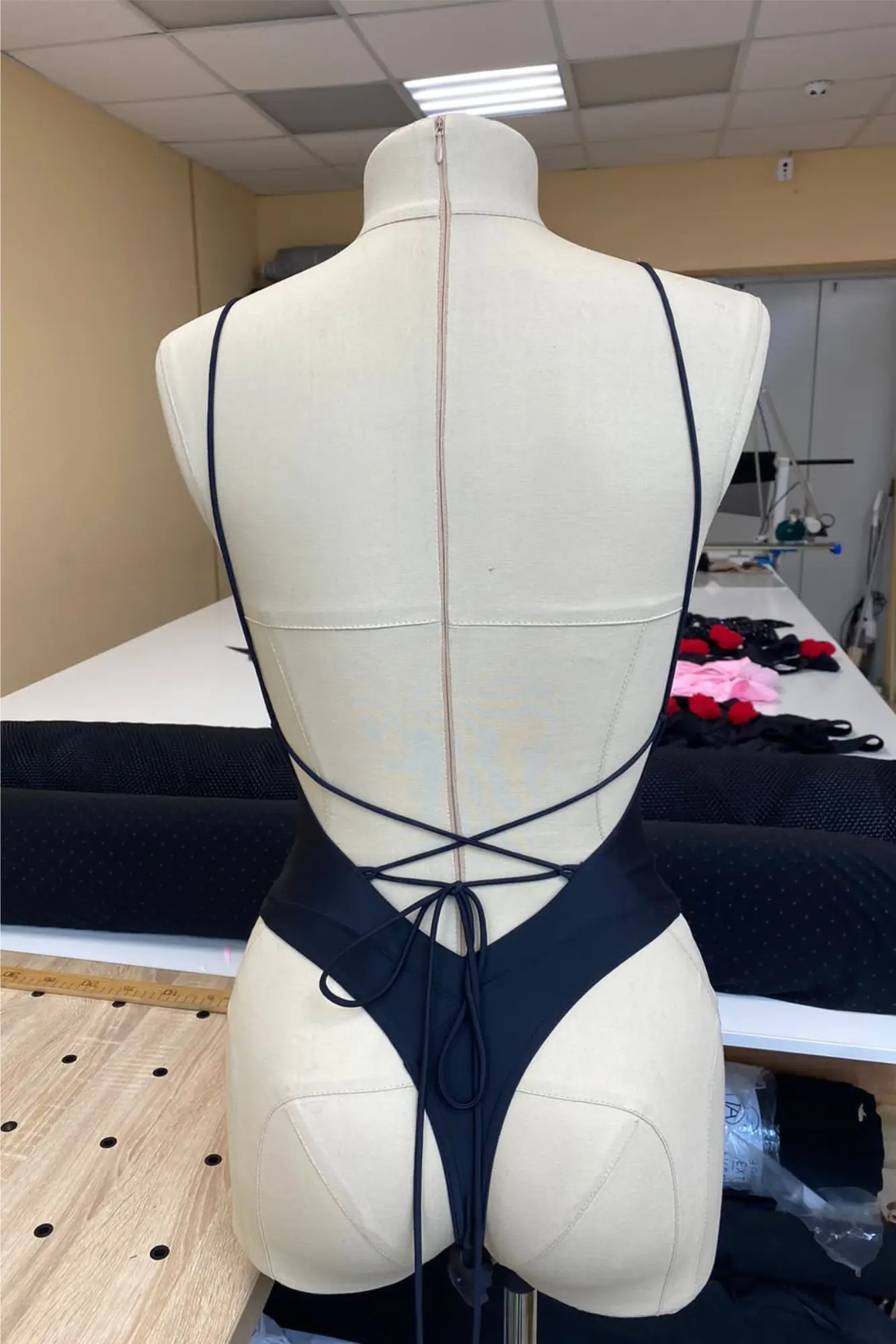 Слитный купальник с глубоким V-образным вырезом на груди, линия декольте декорирована воланом. Глубокий вырез на спине, со шнуровкой, трусики-стринг. Купальник продублирован сеткой.
