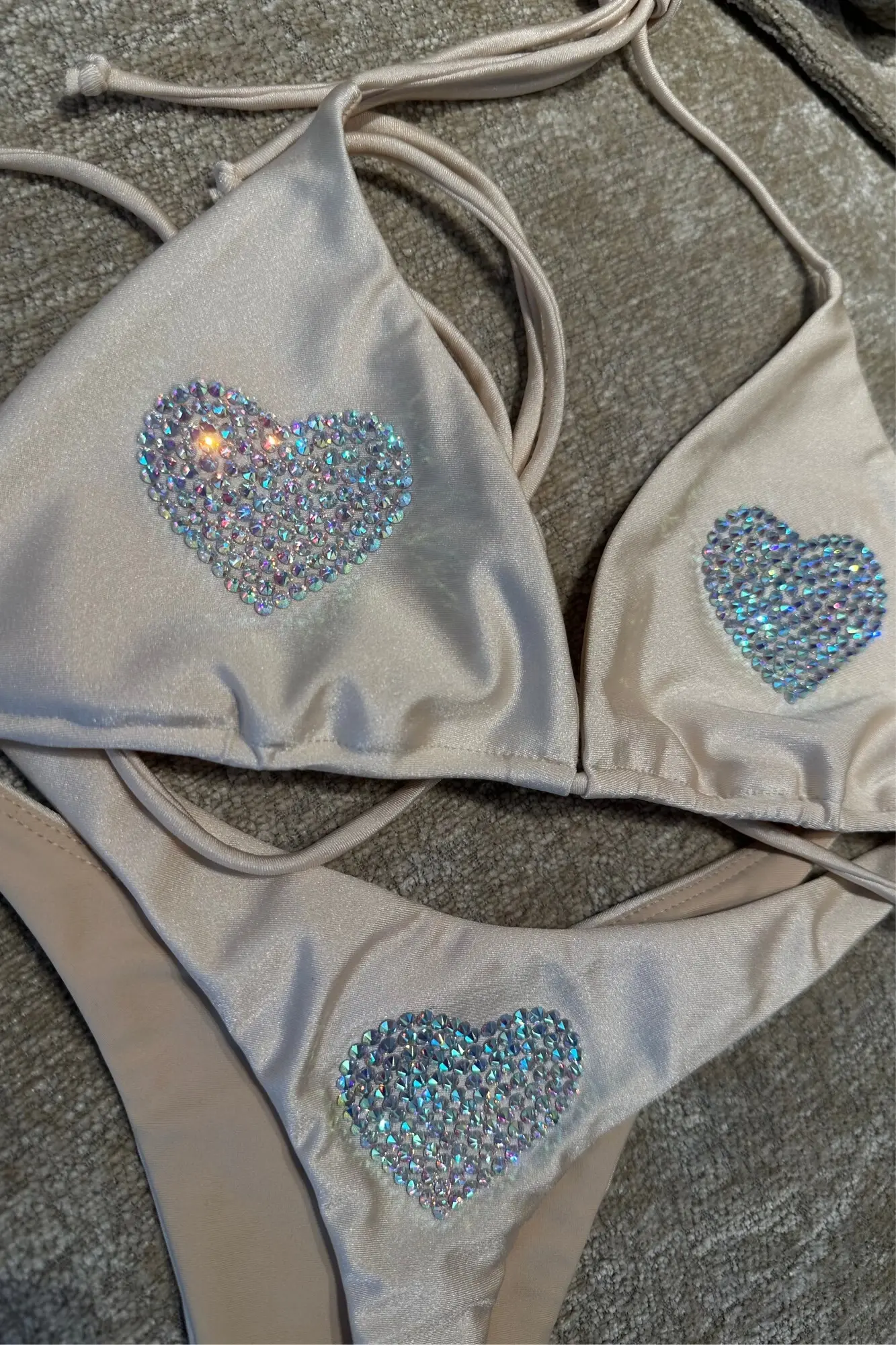 Бикини из эластичного трикотажа, продублирован сеткой изнутри. Аппликация из страз на лифе и задней части трусиков. Трусики-стринги.