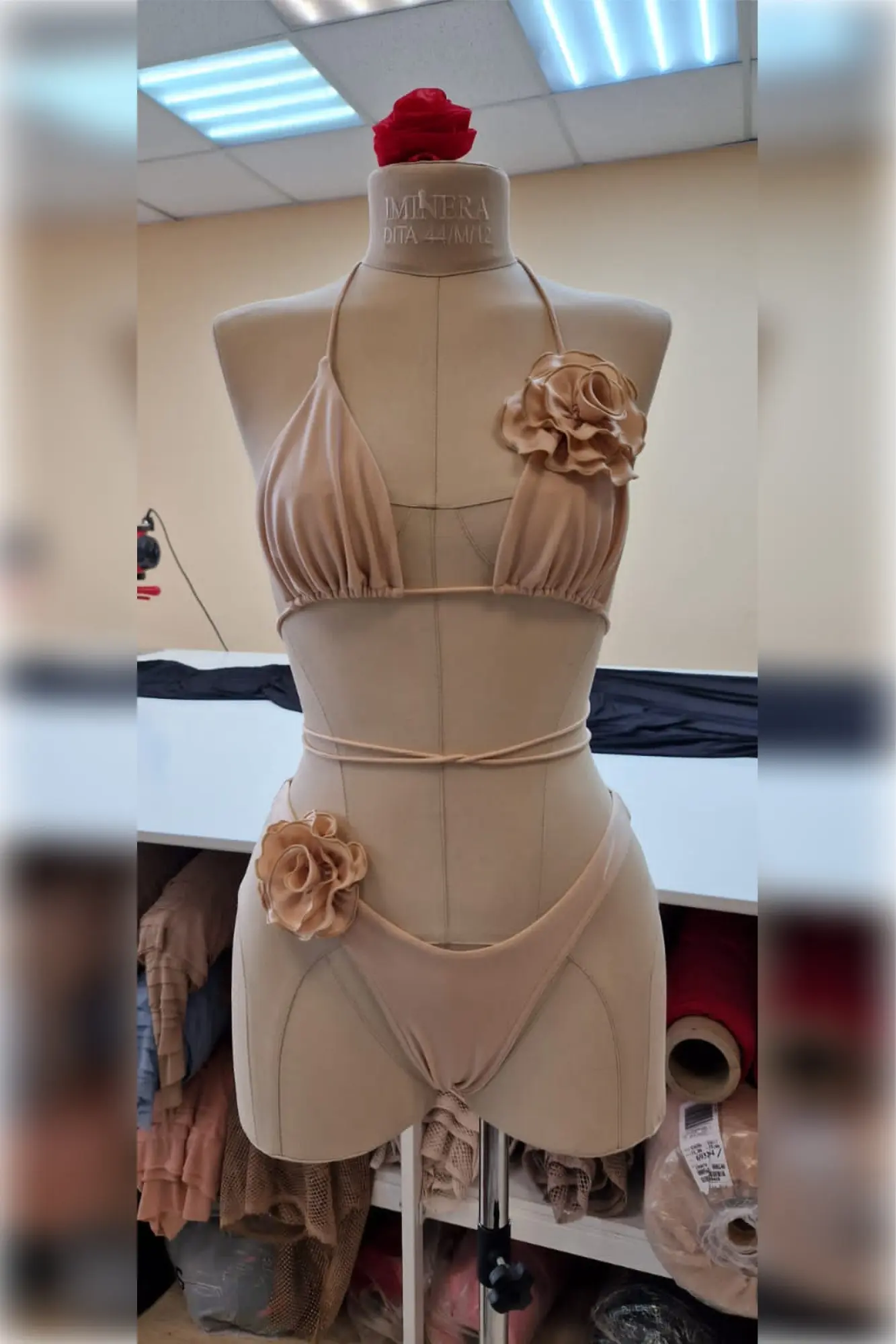 Раздельный двуслойный бикини из бифлекса, длинные завязки-спагетти, аппликация в виде цветка на чашке и трусиках. Трусики-стринг.
