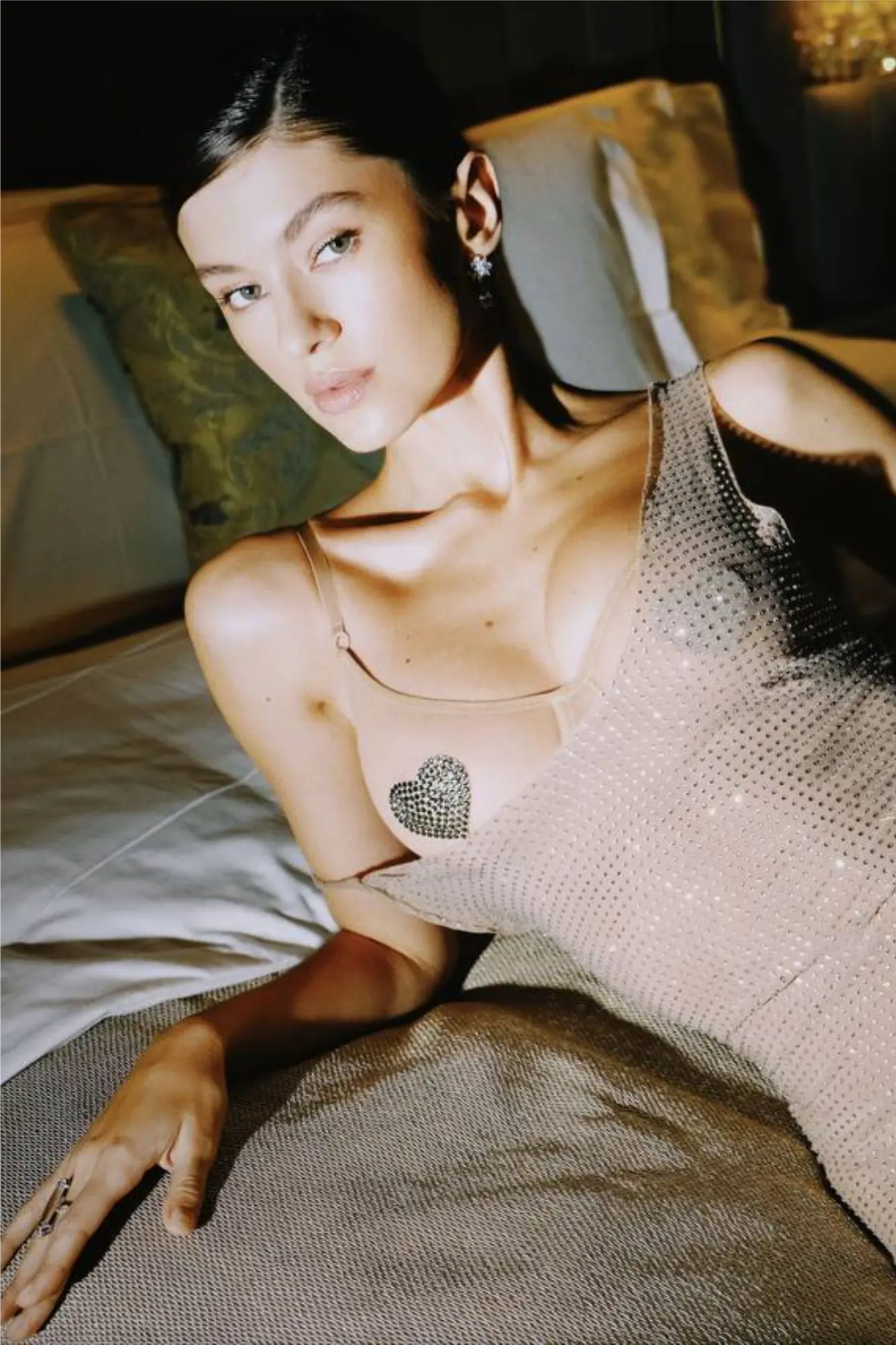 Однослойное изделие бельевого типа из эластичной сетки со стразами, необработанный край, приталенный футляр, без застежек.