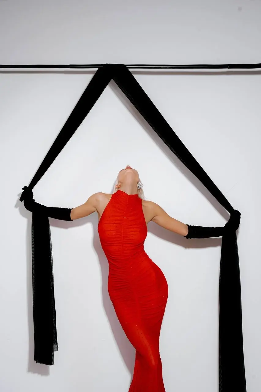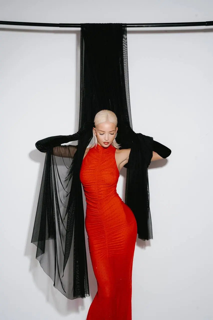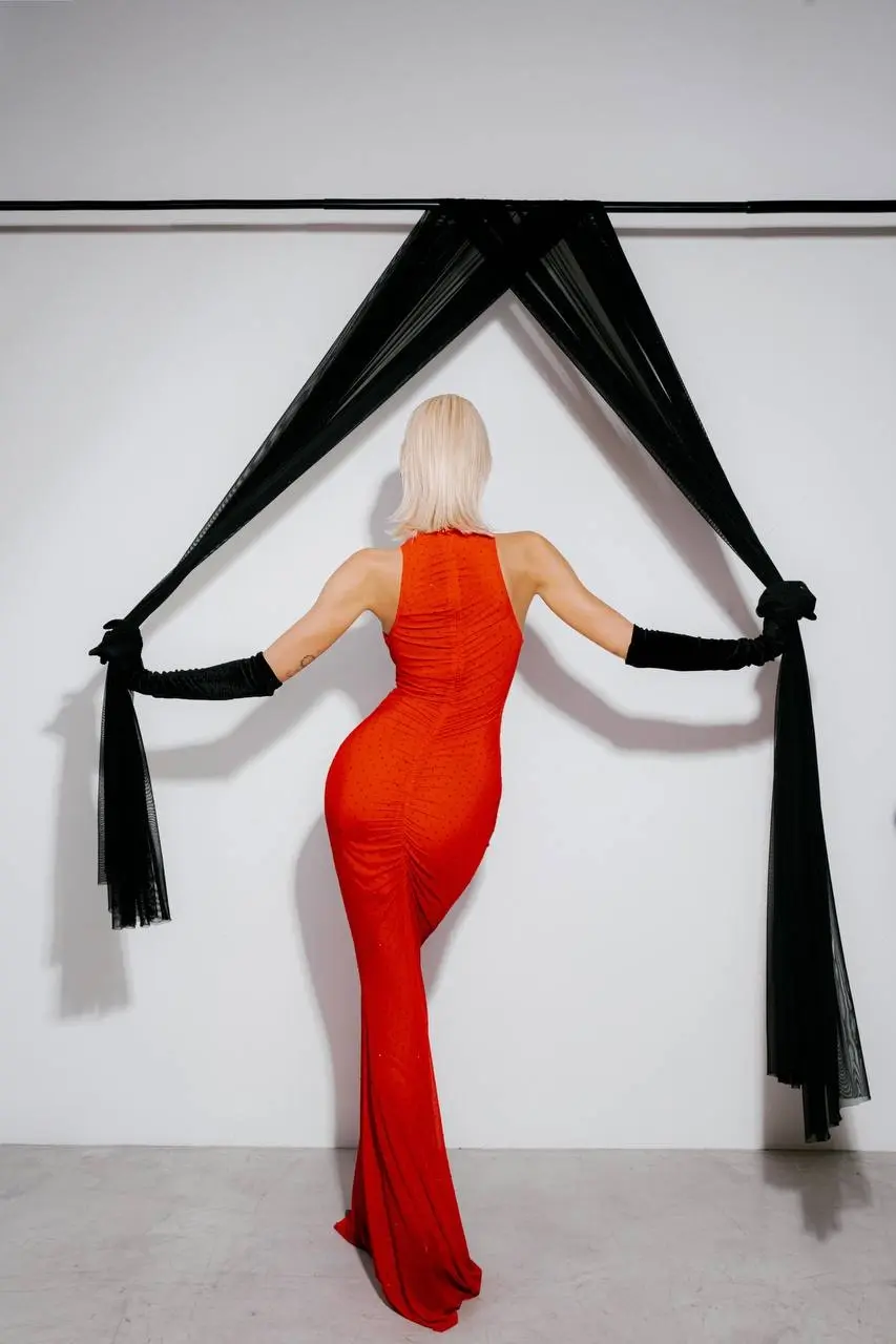 Платье бельевого типа из стразовой сетки в длине макси. Сборка по центру платья, молния на спине. Расклешенный к низу силуэт.