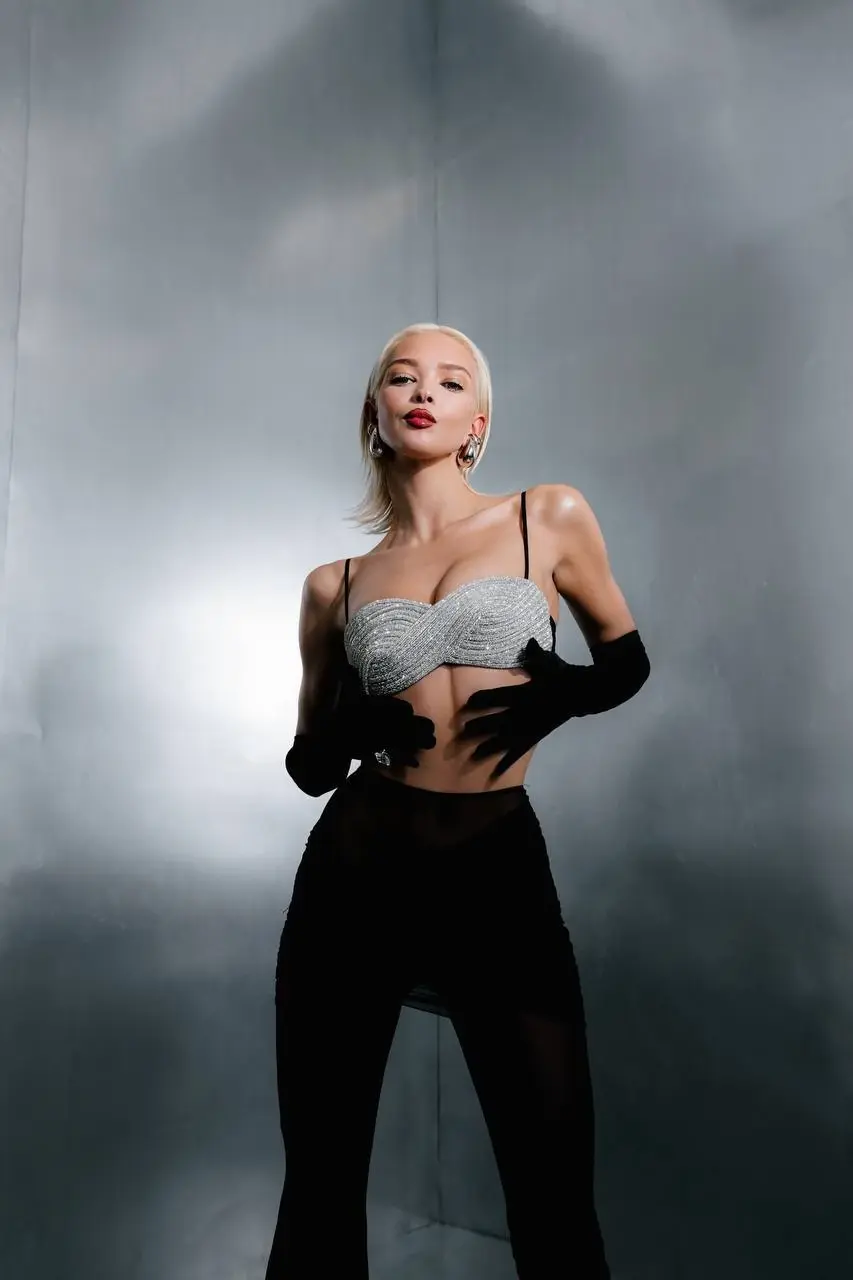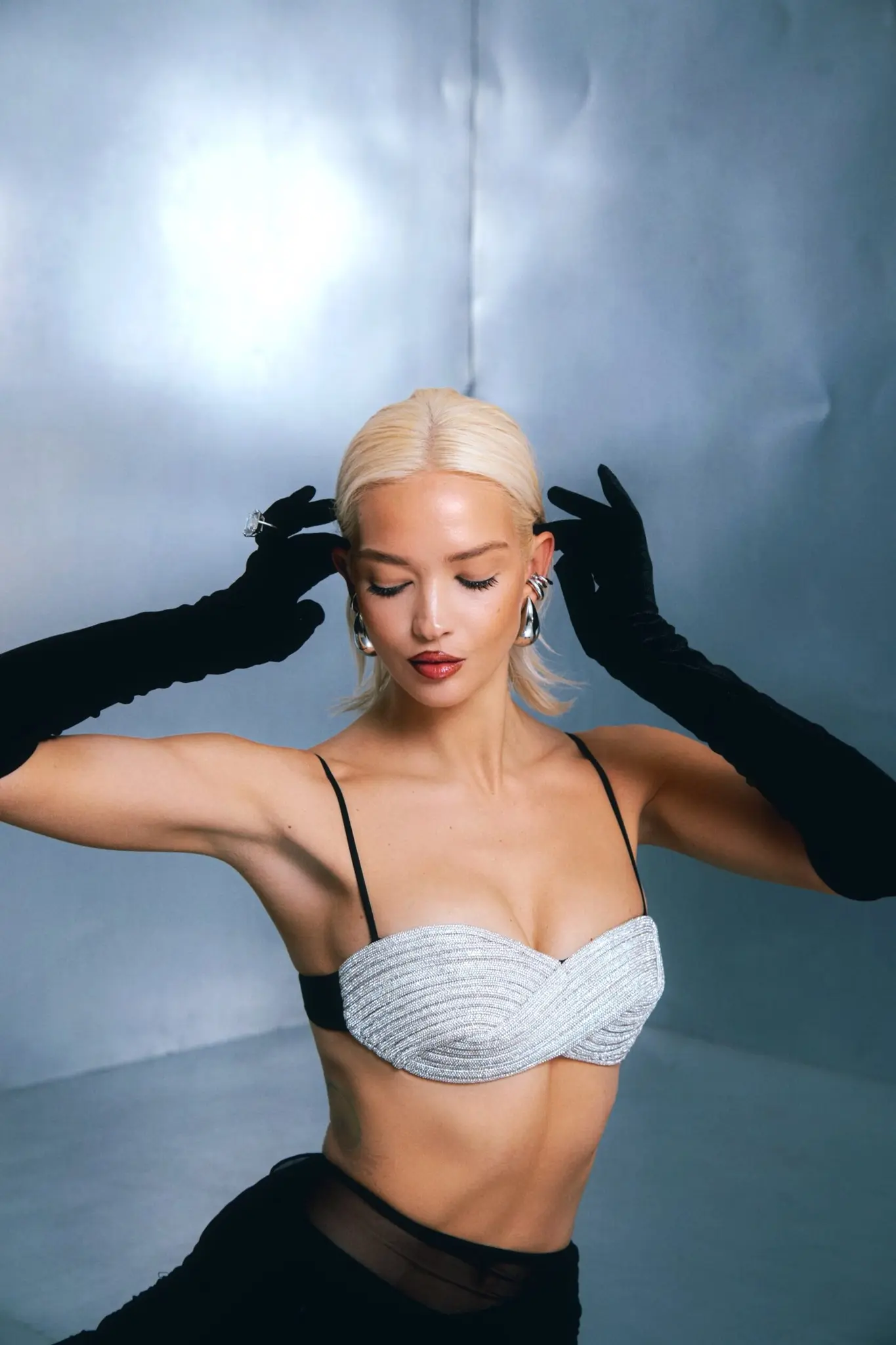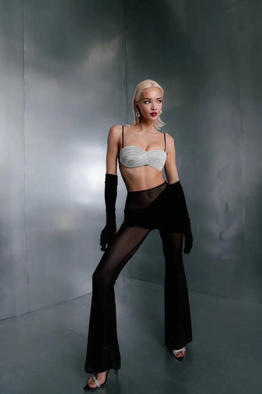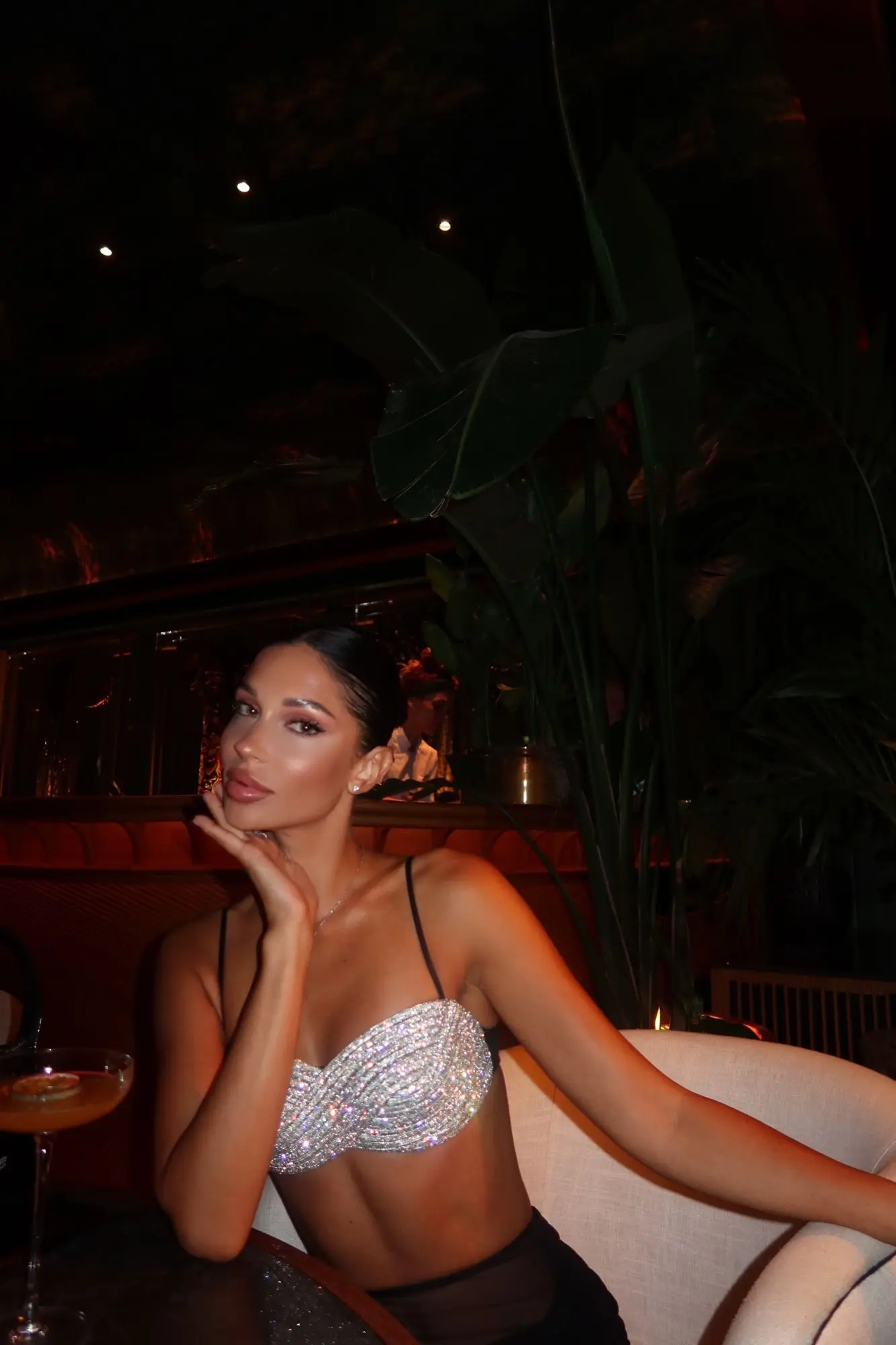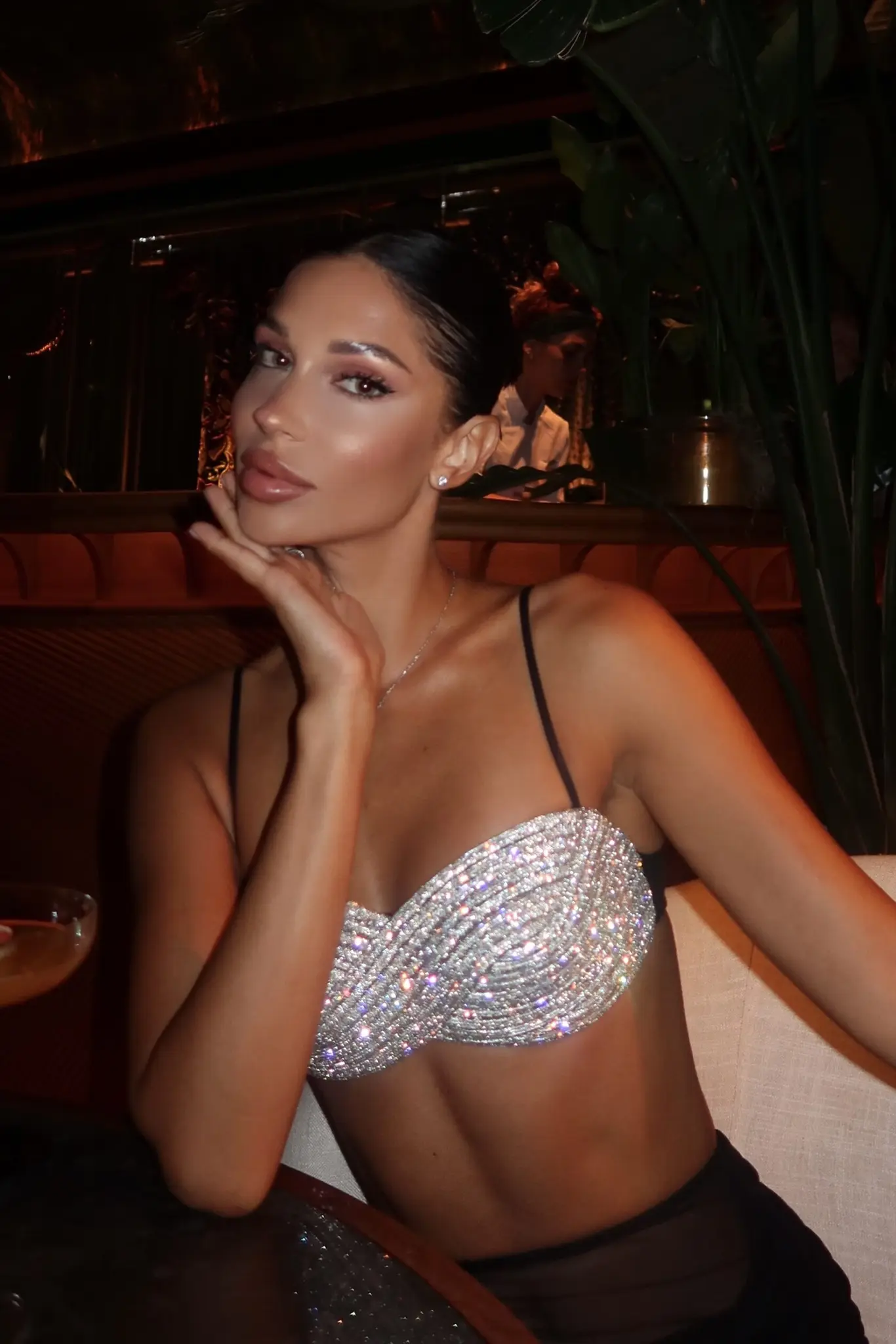 Топ-бюстье со стразовым декором, тонкие лямки с регуляторами, эластичная деталь на спине.