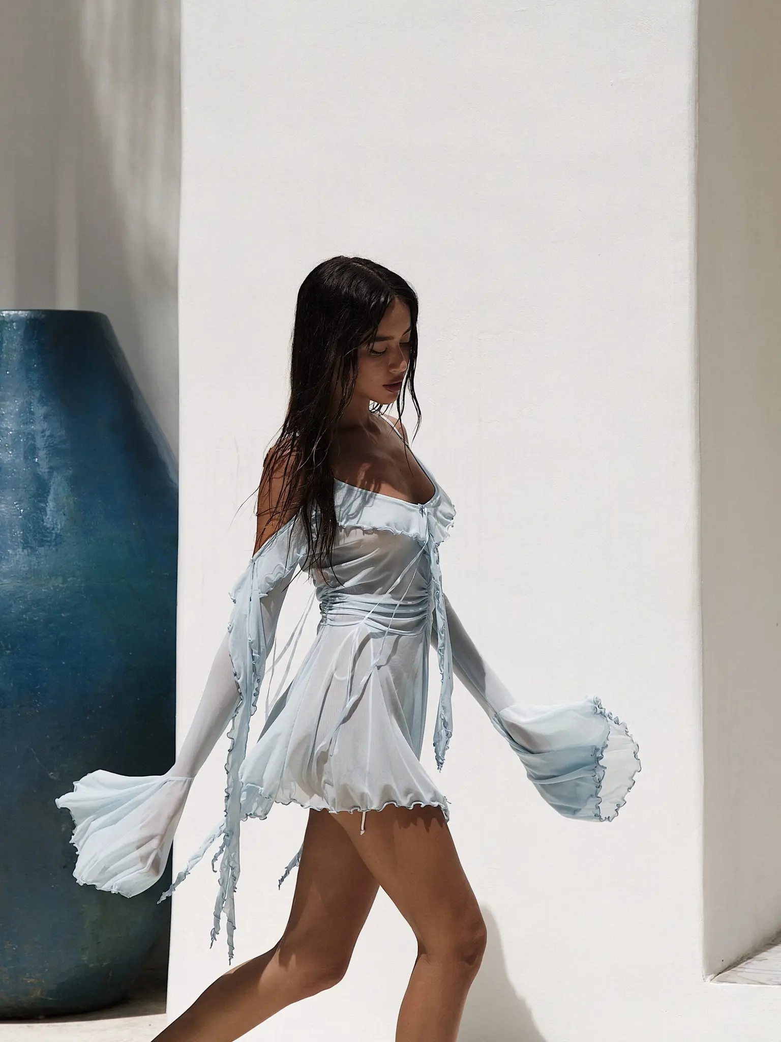 Однослойный топ-туника, бельевого типа. Расклешённый, удлиненный рукав, бретели с регуляторами.