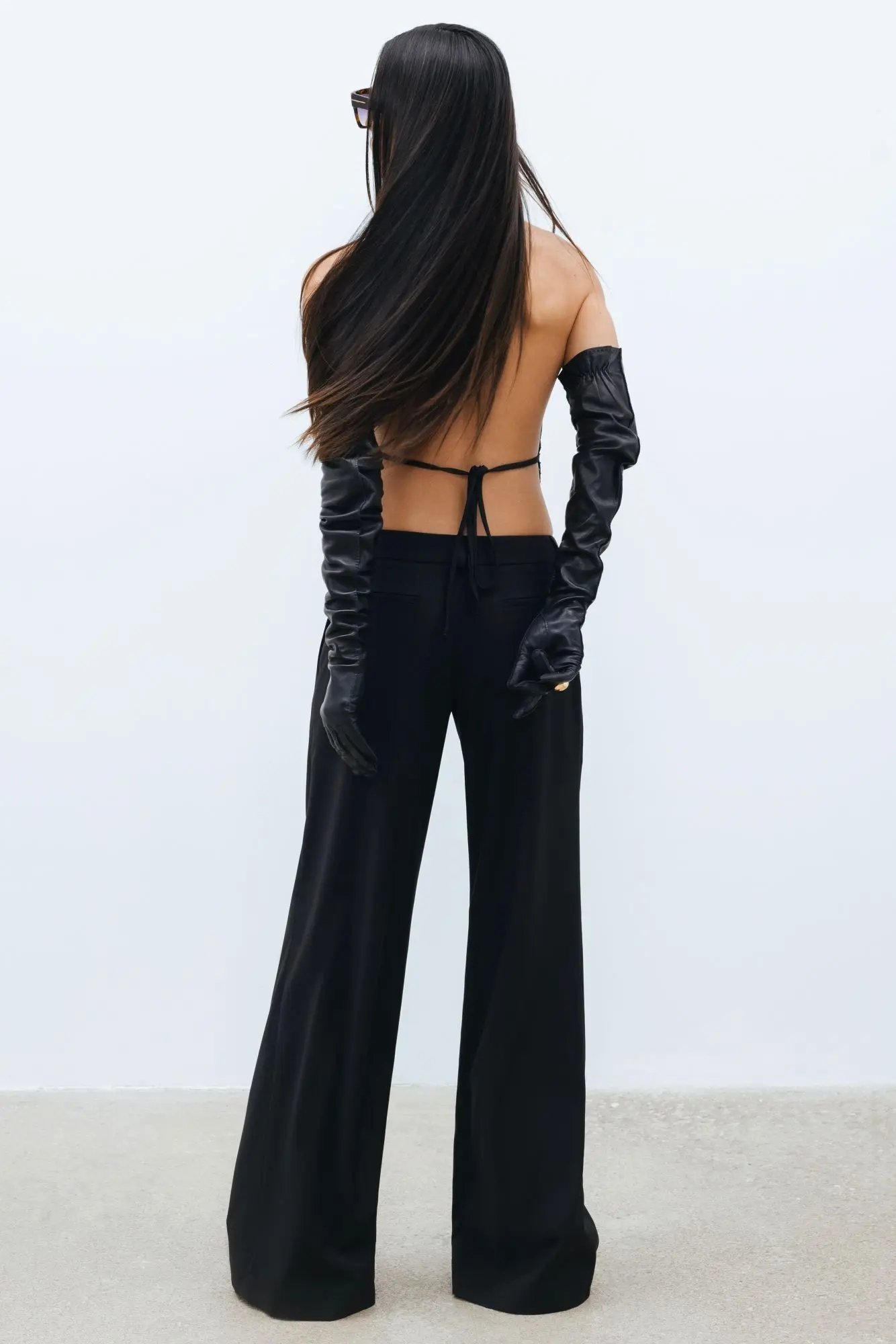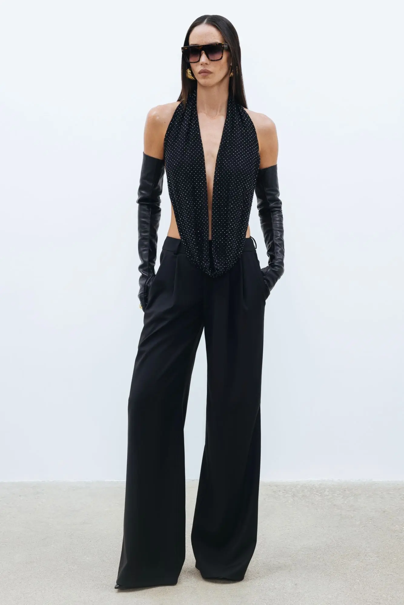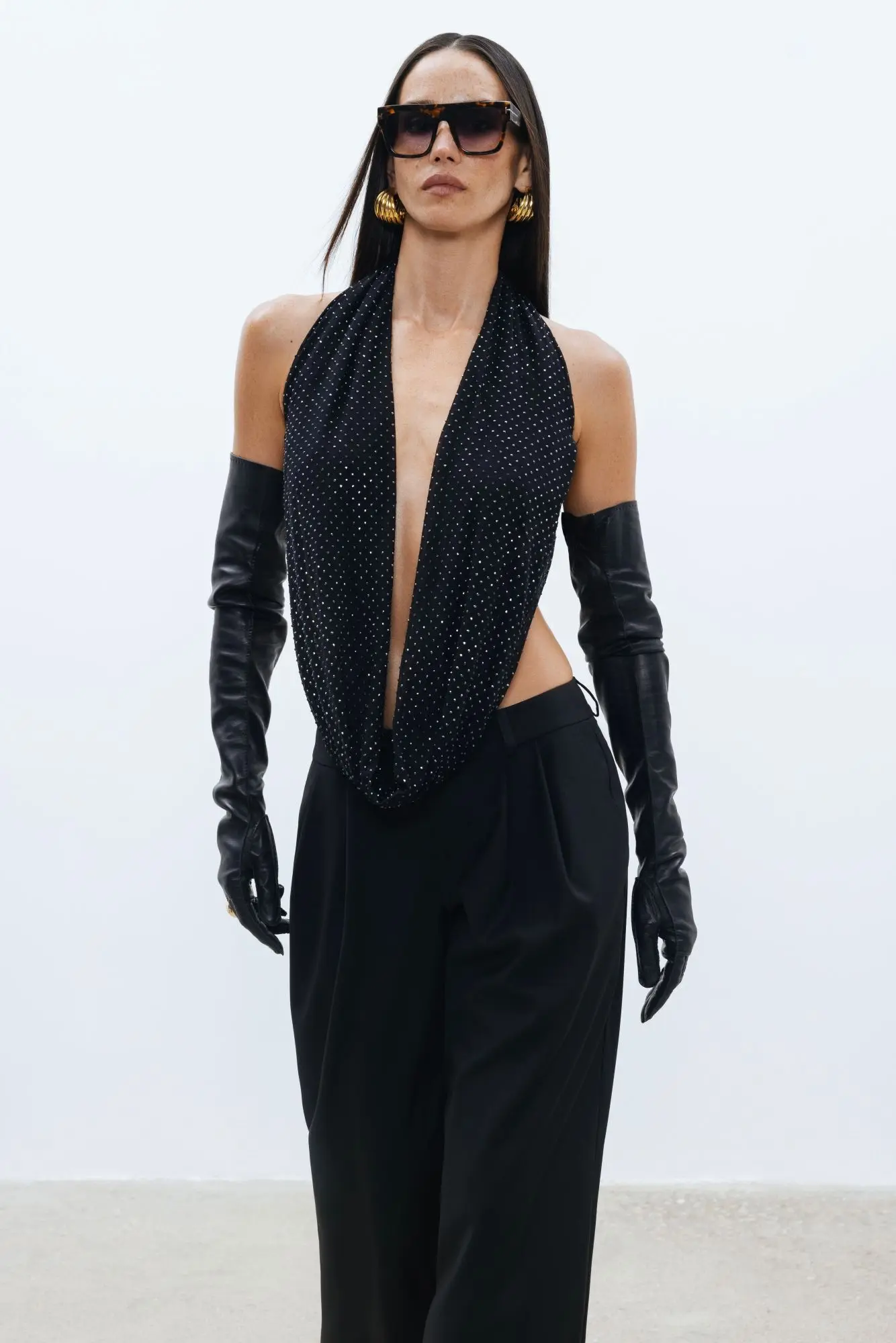 Топ-петля из стразовой сетки, длинные шнуры-завязки.