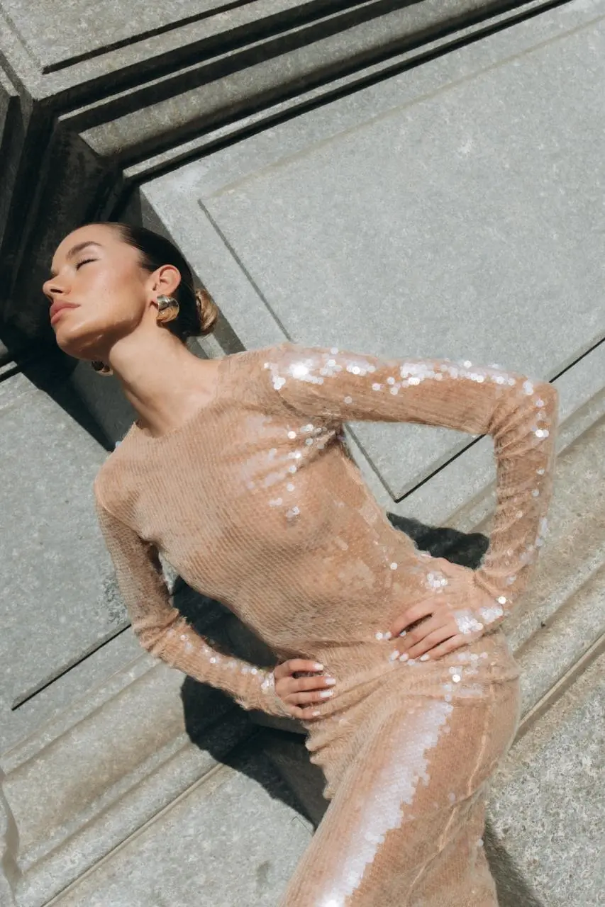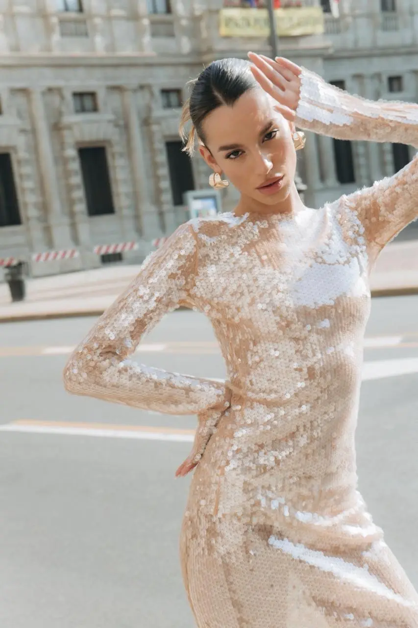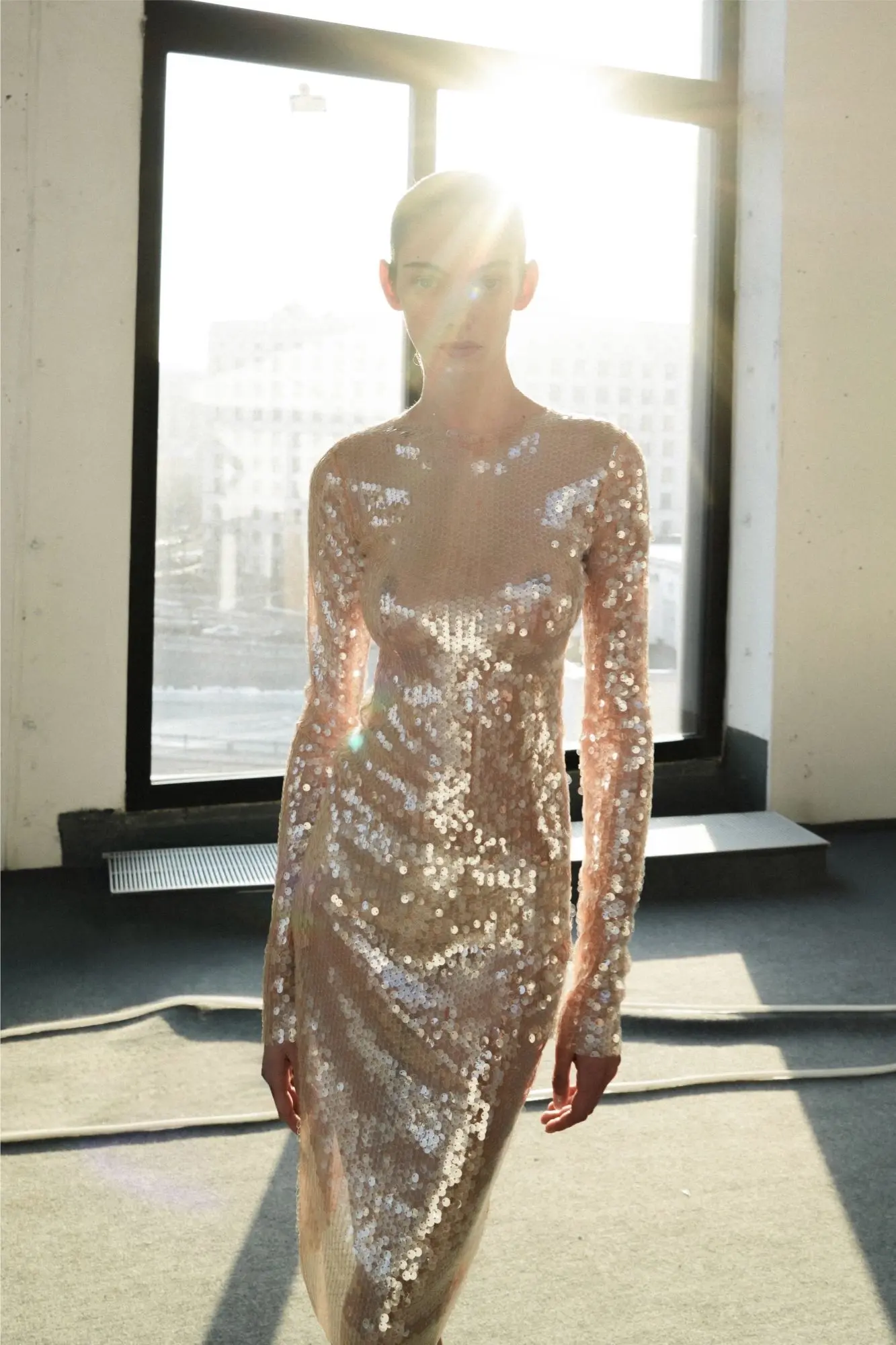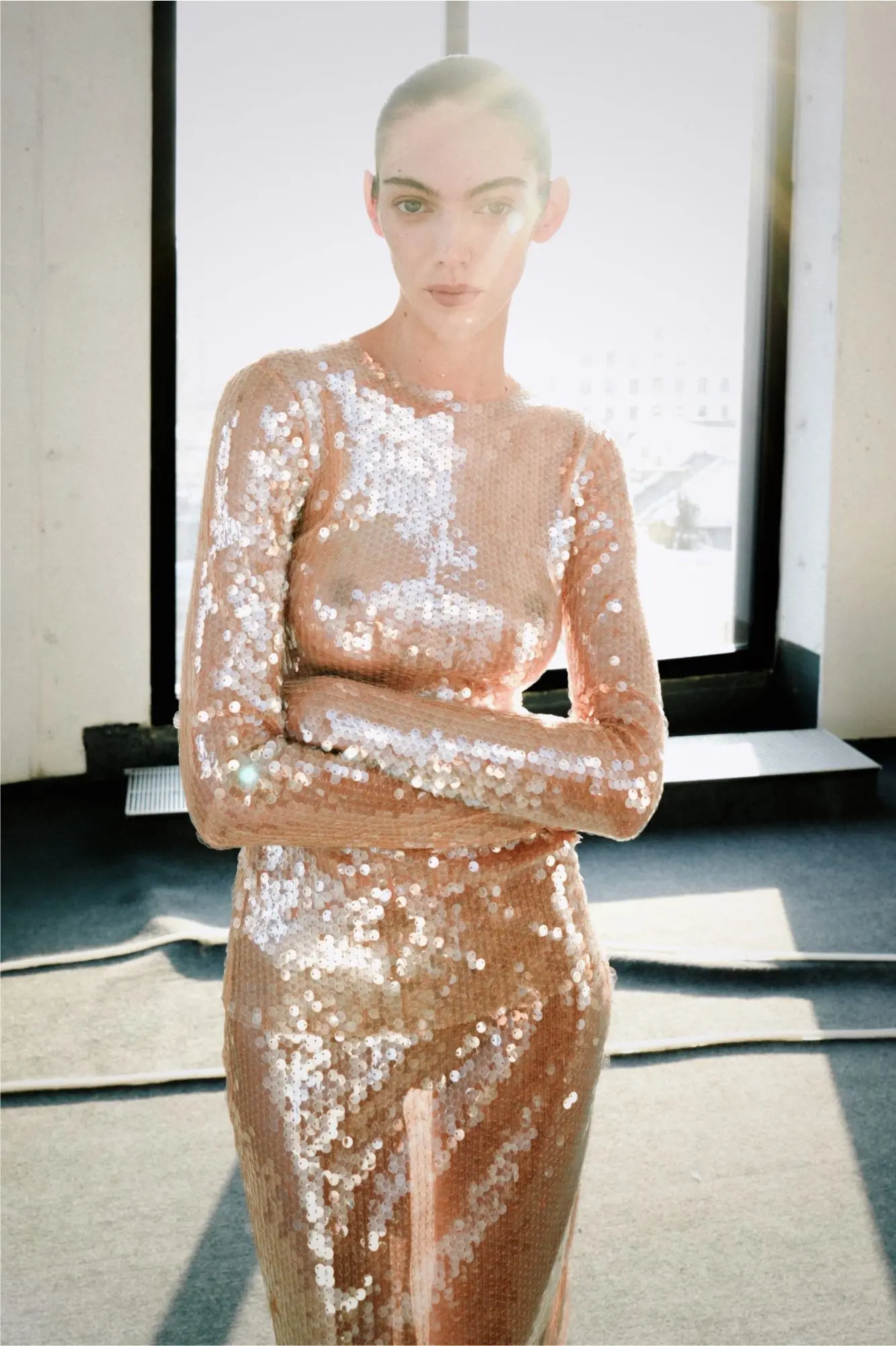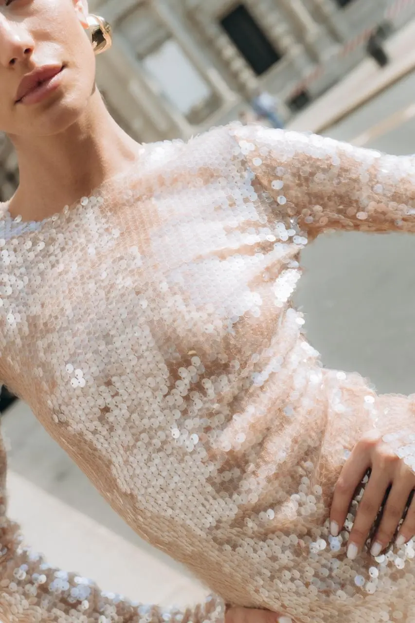 Юбка из однослойной эластичной сетки с паетками, длина миди, без застежек.