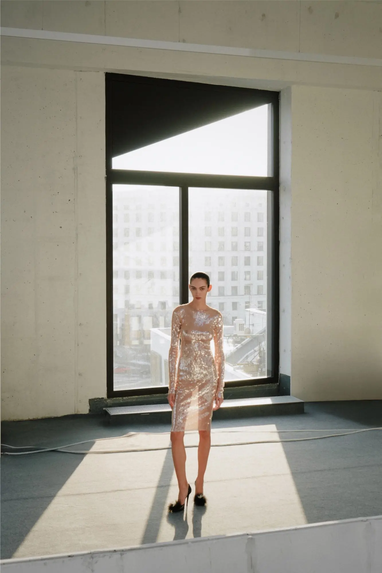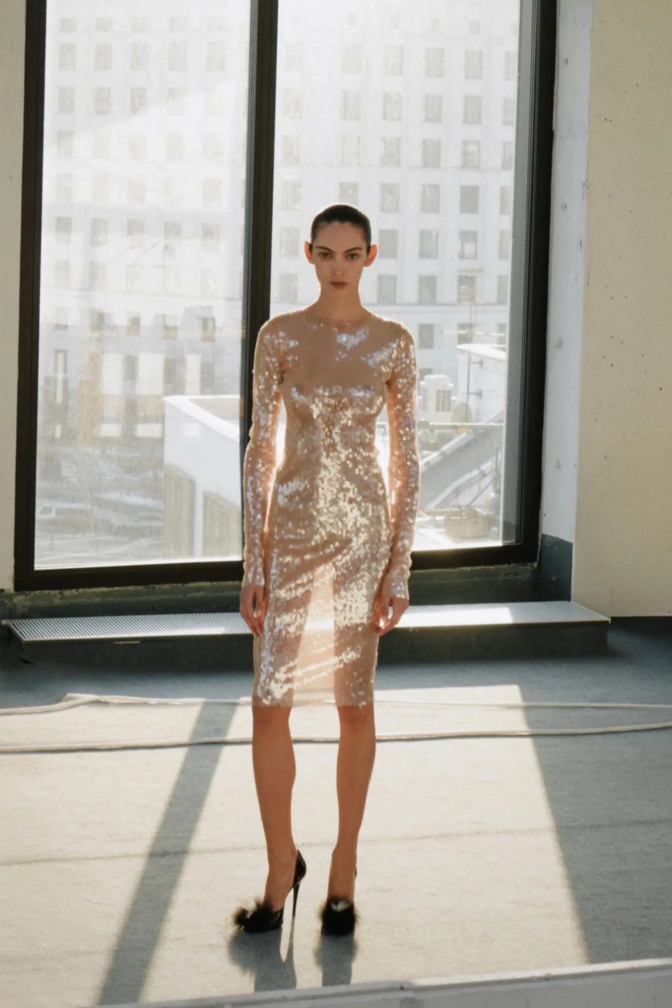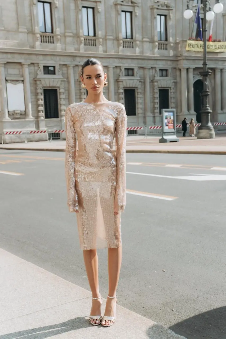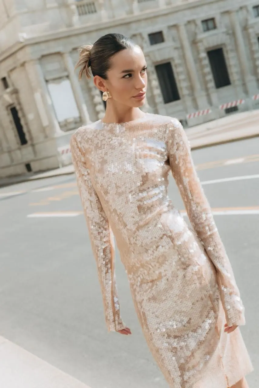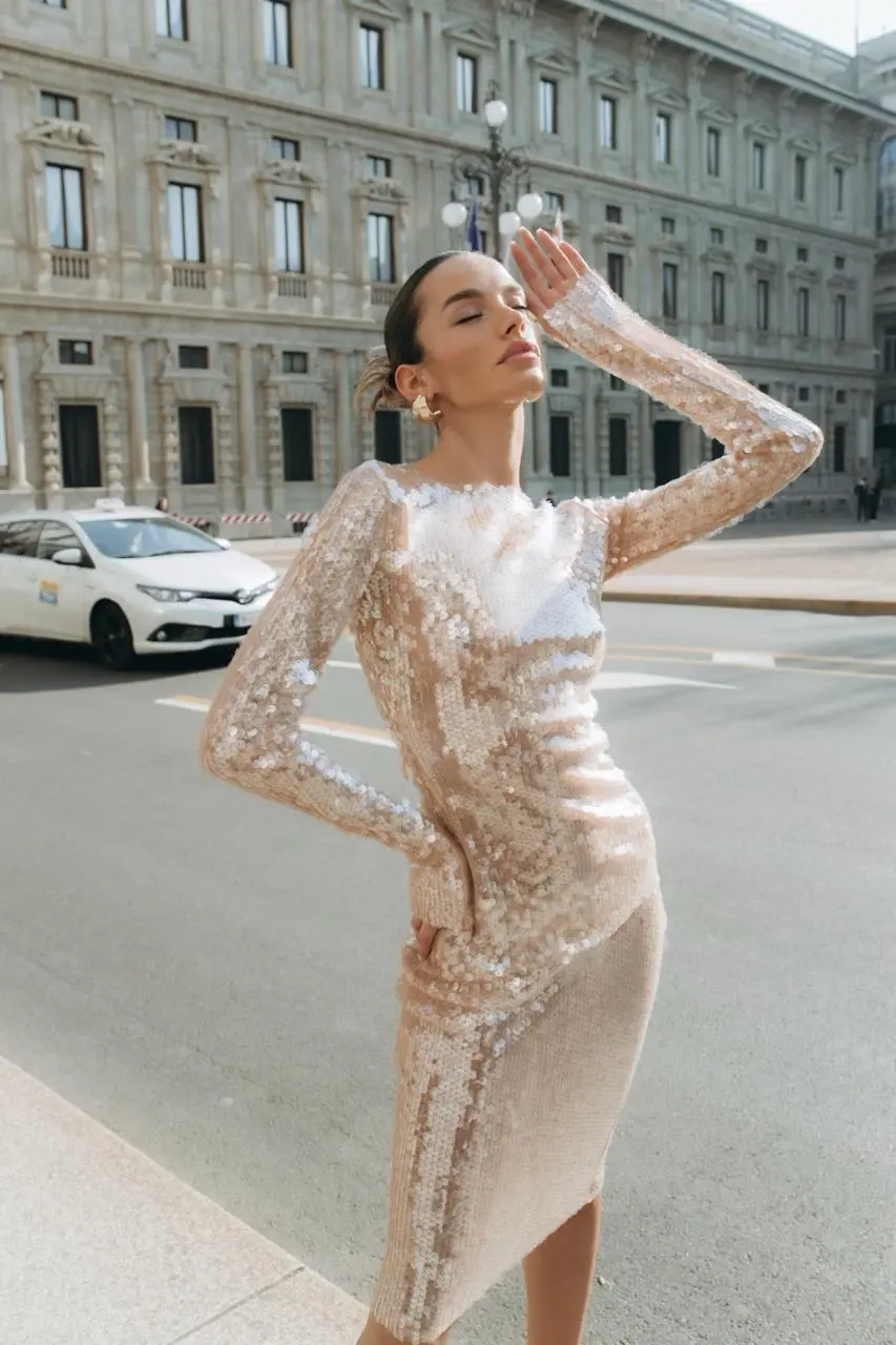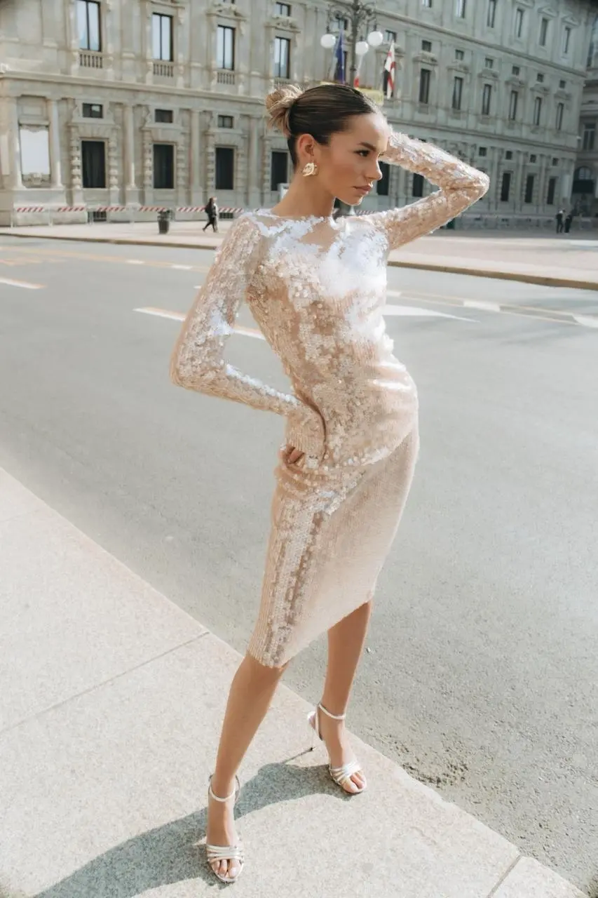 Юбка из однослойной эластичной сетки с паетками, длина миди, без застежек.