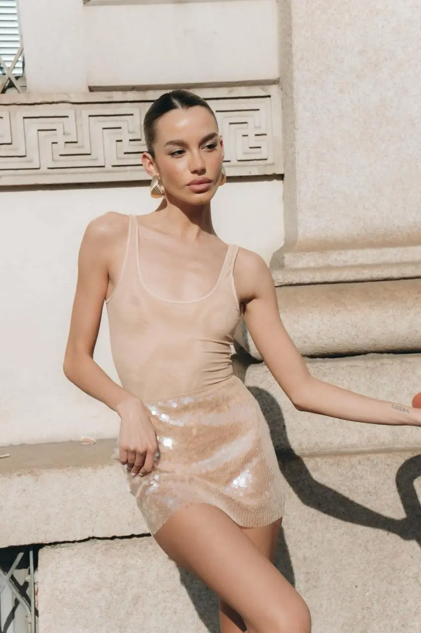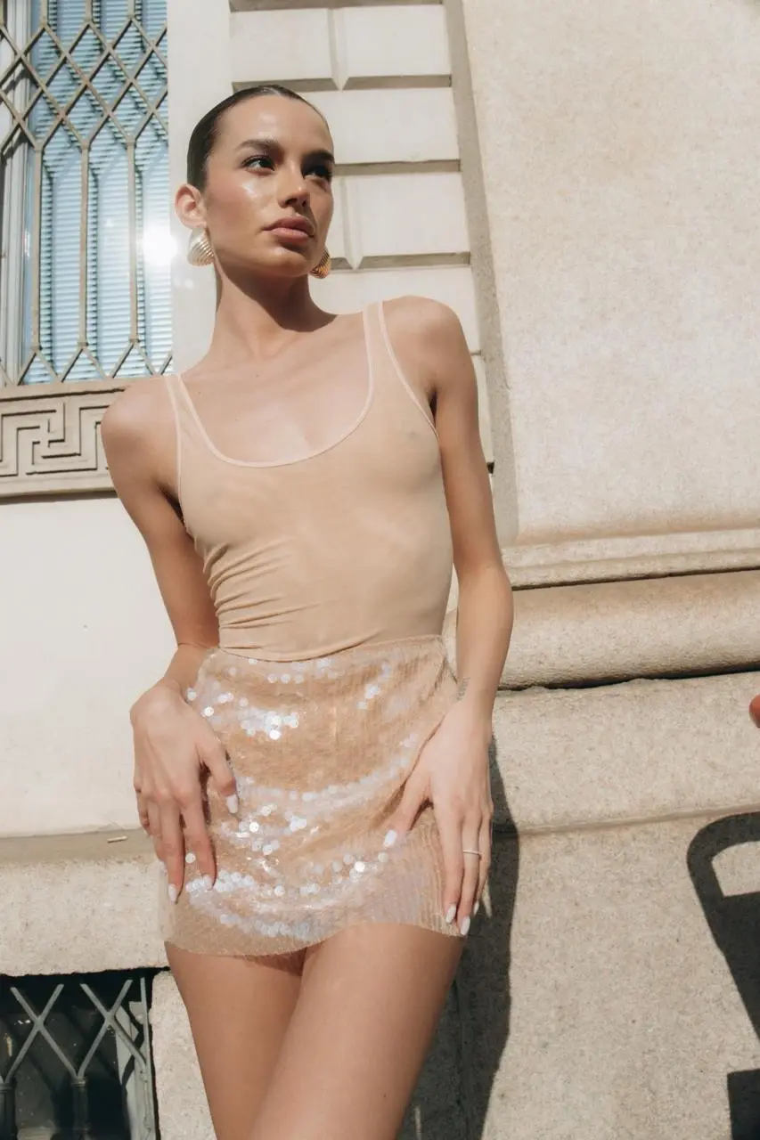 Юбка из однослойной эластичной сетки с паетками, длина мини, без застежек.