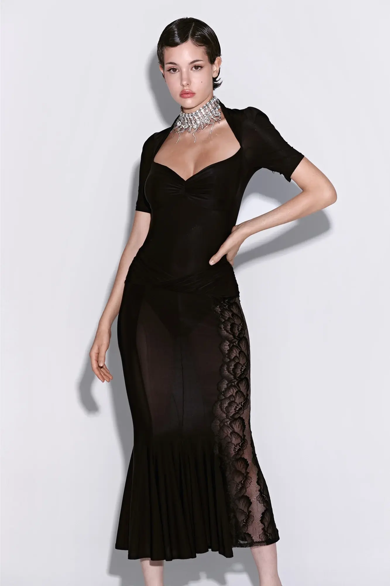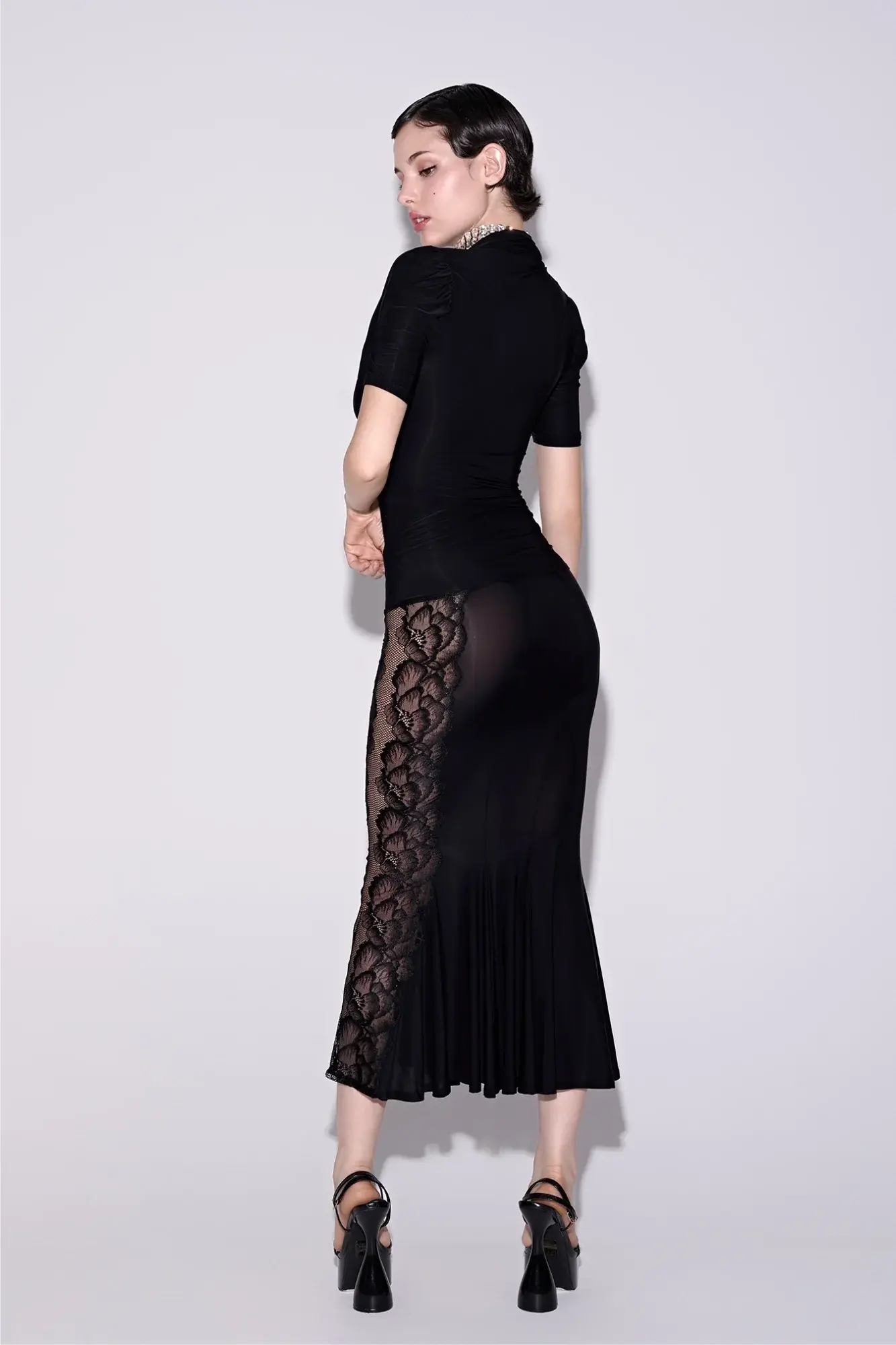 Юбка из эластичного трикотажа, вставка из кружева на боку.