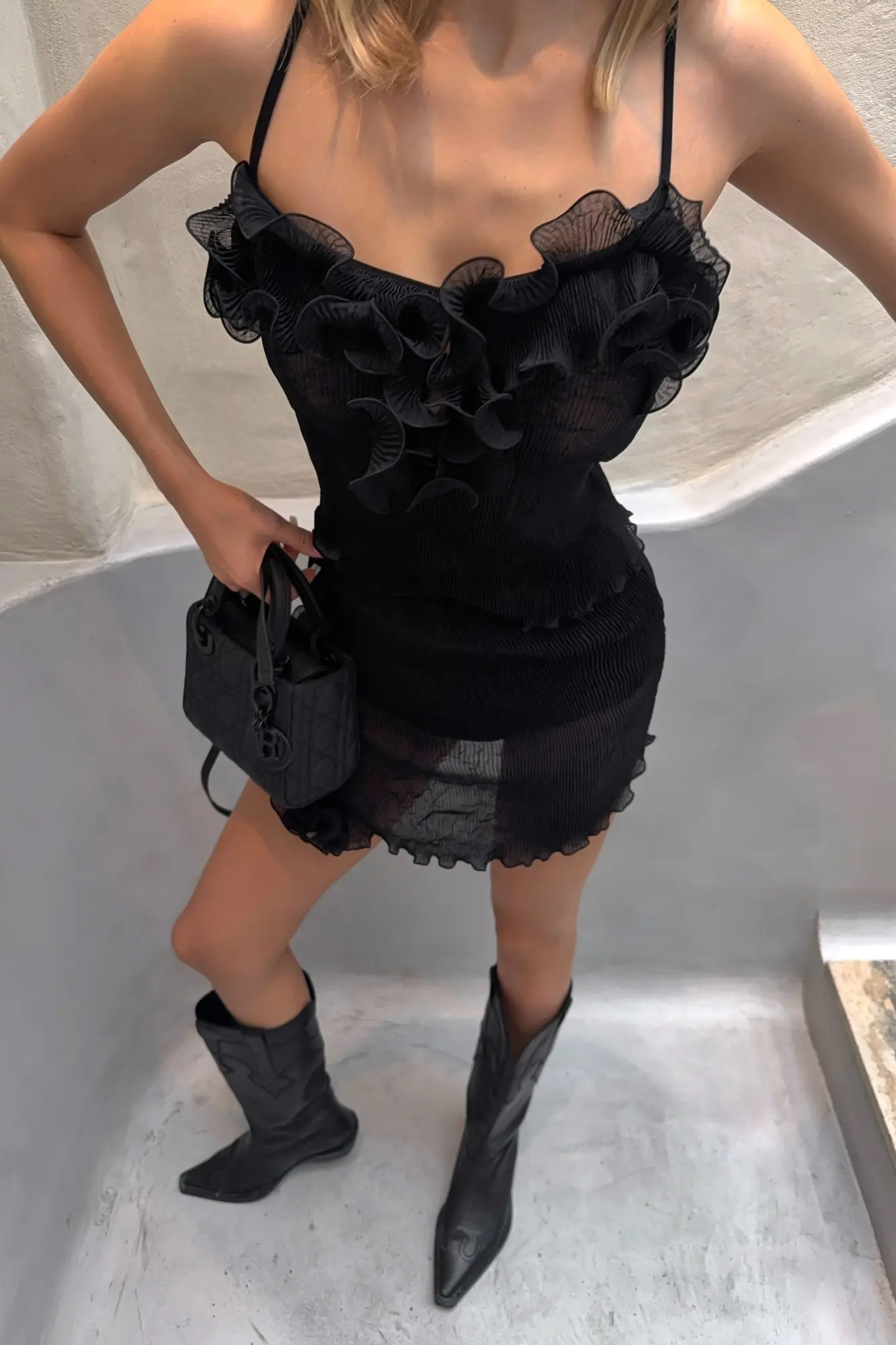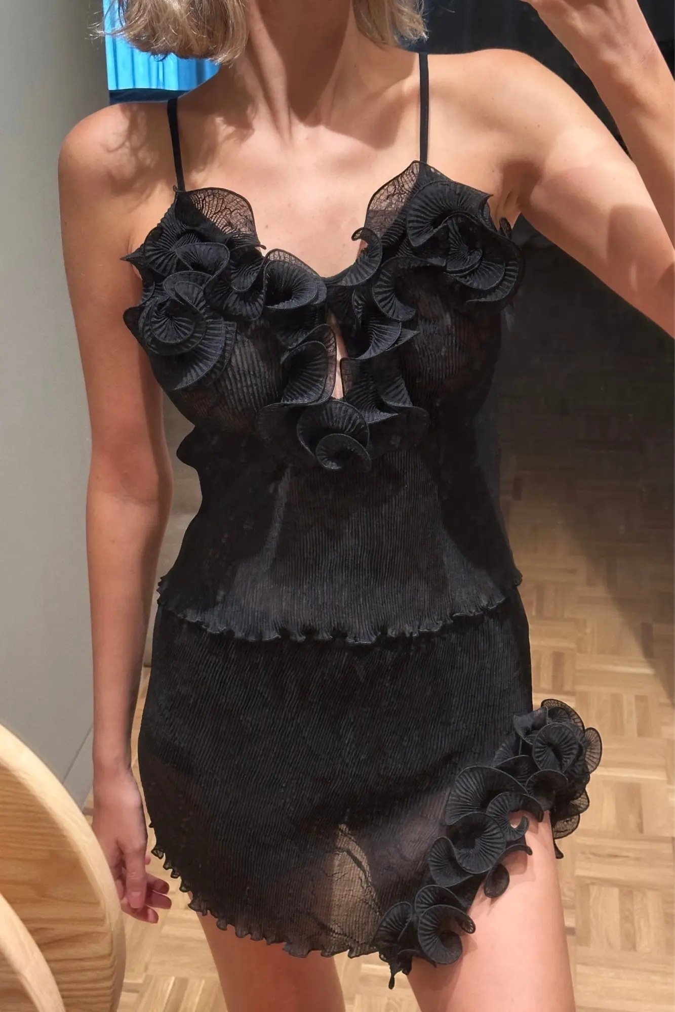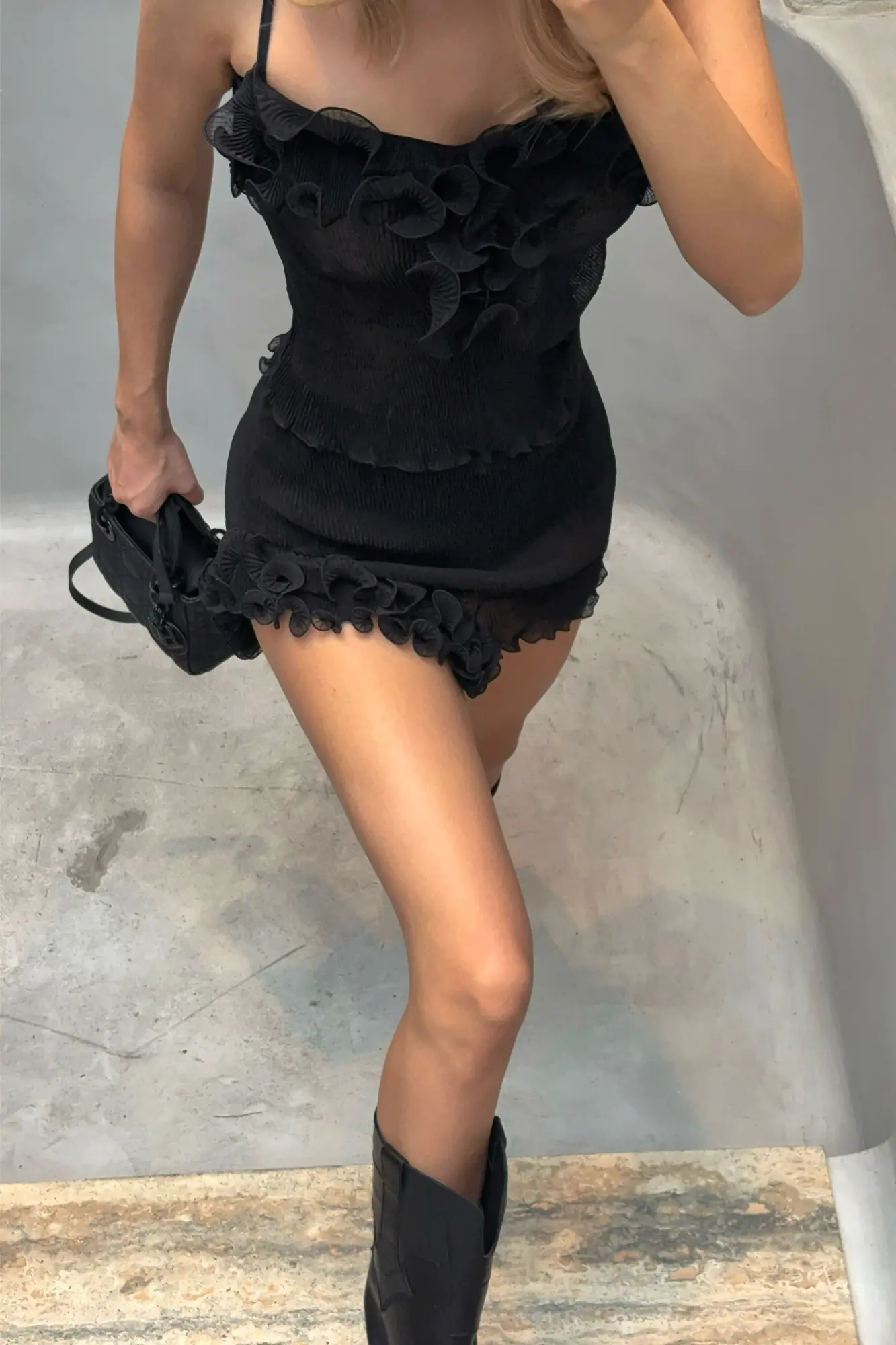 Юбка-шорты из эластичной жатой сетки. Внутри шортики-трусики из сетки, не съемные. Вырез на ноге с фигурной рюшей.
