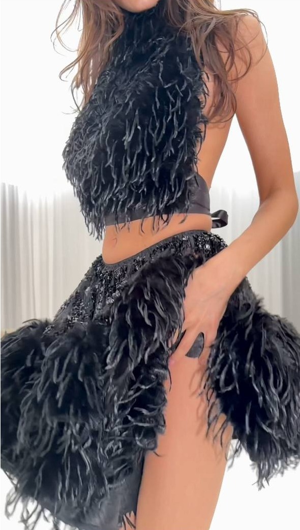 Комбинированная юбка из кружева, расшитого бисером и искусственного меха с перьями.